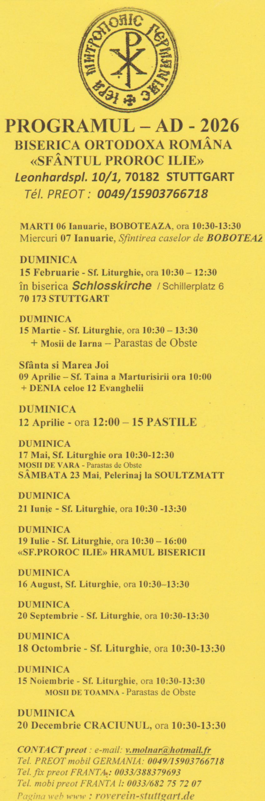 Asociația noastră împreună cu Parohia ortodoxă română „Sfântul Ilie“ din Stuttgart organizează de obicei în a 3-a duminică a lunii, în biserica Leonhardskirche (Leonhardsplatz 26, 70182 Stuttgart) slujba în limba română, oficiată de părintele Vasile MOLNAR.